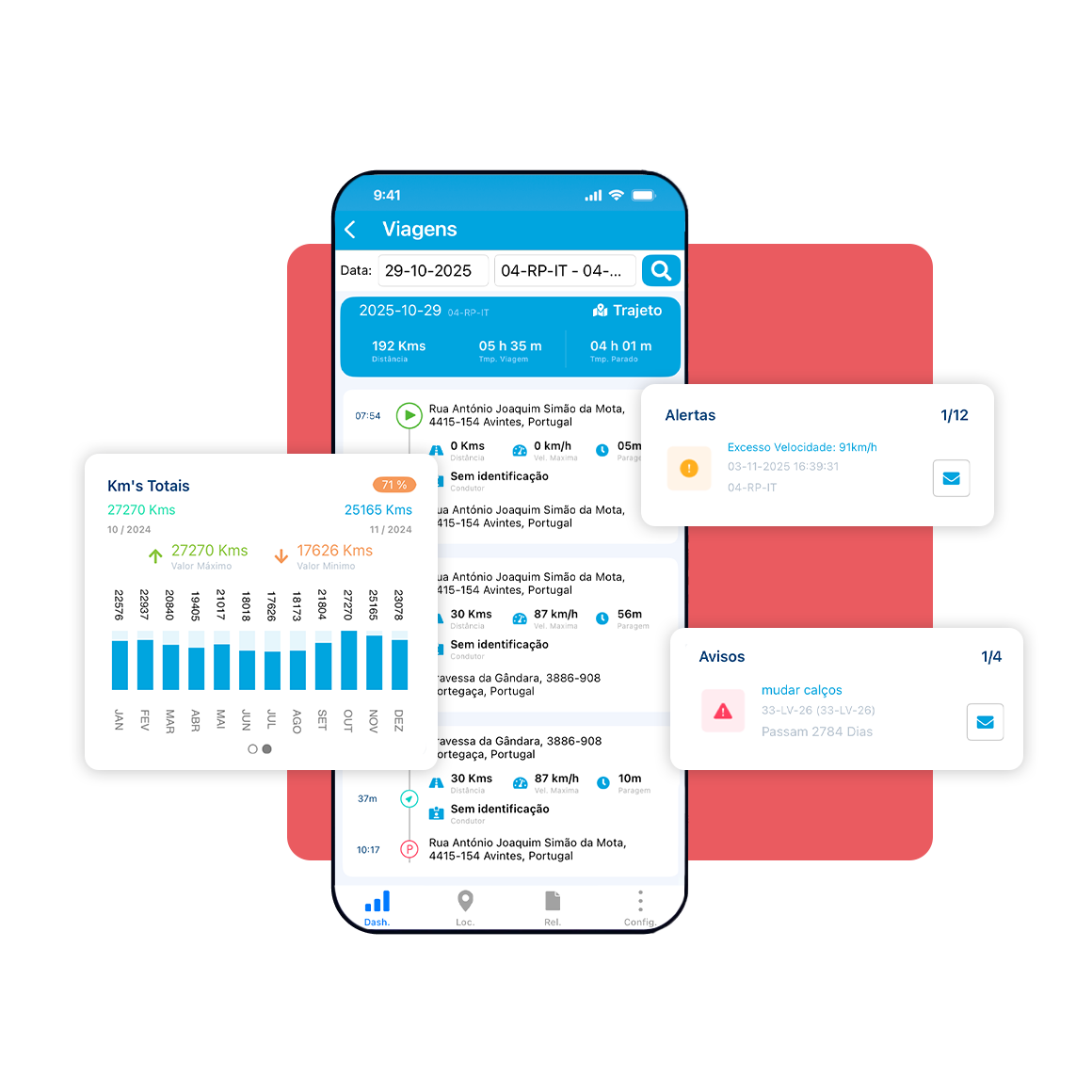 Relatório de atividade diário, relatório de viagens, alertas, uso indevido, custos, resumo por km, entre muitos outros. Podem ser consultados online na aplicação ou enviados periodicamente para um endereço de email.